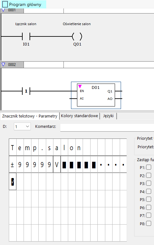 • Lampa (oświetlenie salonu): podłączona do wyjścia przekaźnikowego Q01